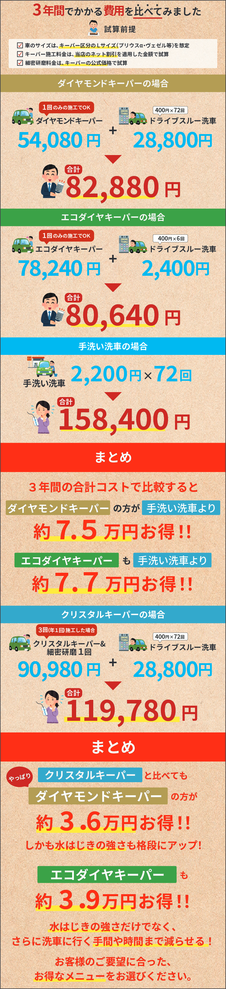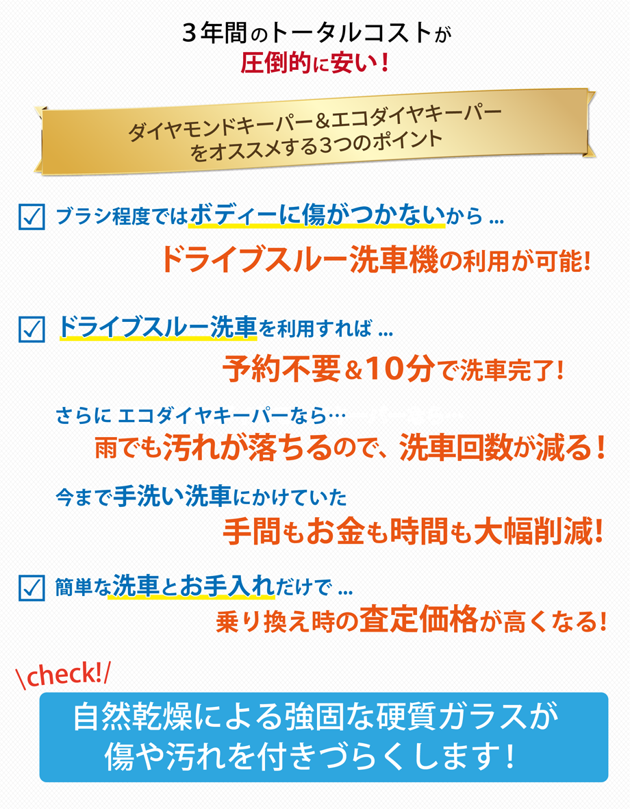 長く乗る予定であればトータルで考えて、ダイヤモンドキーパーの方がお得だということや、こちらのお店でメンテナンスを行えば5年間コーティングが持つことなど詳しく教えてくださいました。