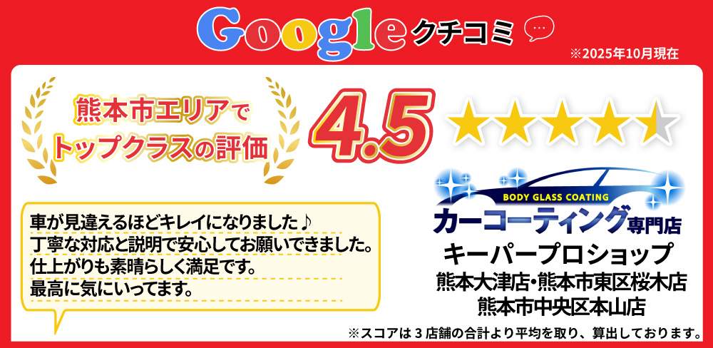 私達キーパープロショップは、熊本市東区・中央区・阿蘇市・宇城市・宇土市・菊池市・菊池郡大津エリアのカーコーティング専門店として、日本ダントツのカーコーティングブランド、キーパーのプロショップとして認定を受けております!